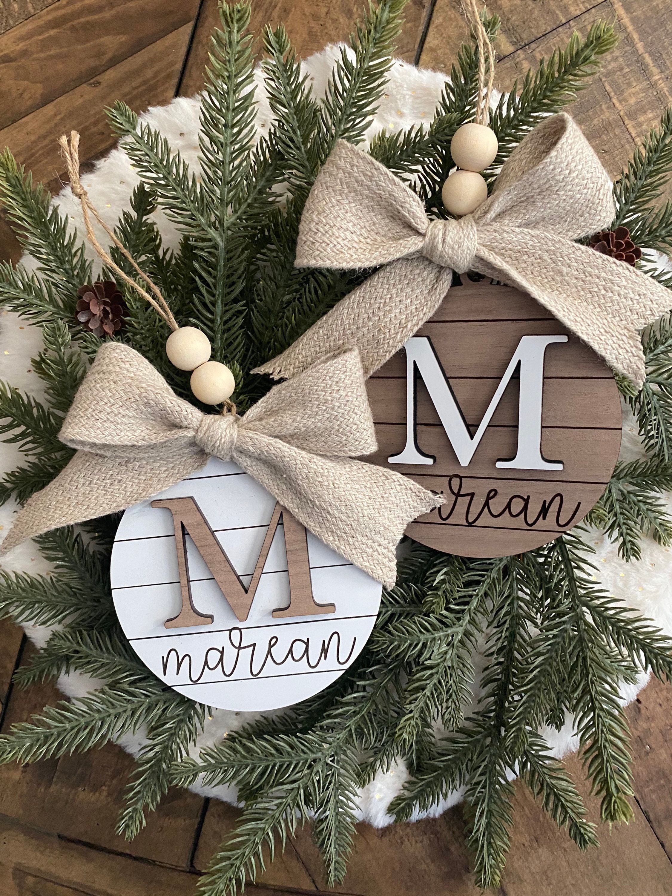 Each ornament is laser engraved on beautiful faux wood shiplap with a laser cut initial placed atop the backer. Each ornament measures 4" in diameter and 1/8" thick backer and 1/8" thick initial. It comes with a twill burlap bow as well as twine to hang. As with all wood products the wood grain may vary between pieces.