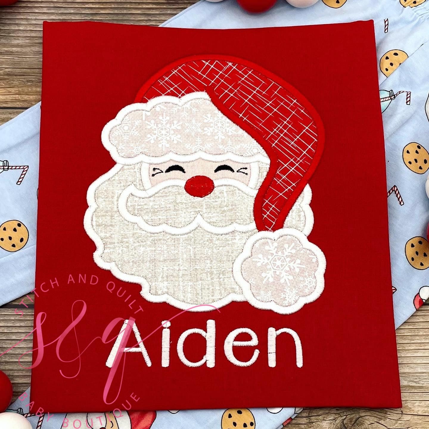 - 1 pair of blue pants with Santa face print